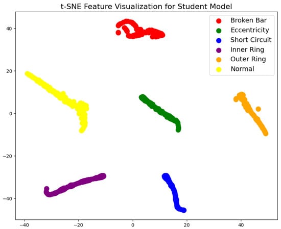 To evaluate the model performance, this study conducted a multifaceted assessment. Using confusion matrices and t-SNE dimensionality reduction visualization, we verified the teacher and student models’ classification ability and feature learning effectiveness across various fault types. The quantized student model was further deployed on a Raspberry Pi edge device, and the application provided a simple and intuitive graphical user interface for industrial on-site users, facilitating fault diagnosis even by non-expert operators. Experimental results demonstrated that the quantized model excelled in inference latency and memory usage, making it well suited for application in resource-constrained edge computing environments.