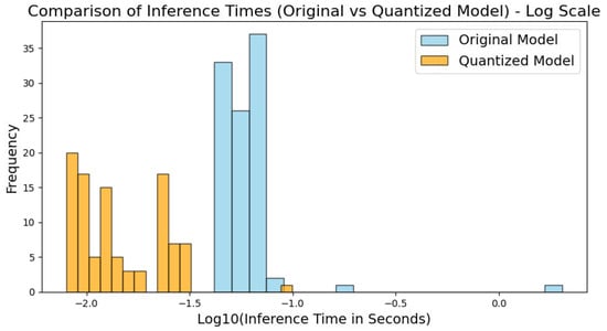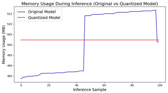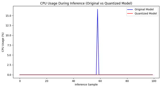 Figure 16 depicts the CPU utilization of the original and quantized models during inference. The results show that the quantized model has virtually negligible CPU usage during inference, whereas the original model exhibits noticeable CPU usage peaks for some inference samples. This indicates that the quantized model utilizes CPU resources more efficiently during execution, avoiding substantial CPU load and making it more suitable for resource-limited applications on edge devices.