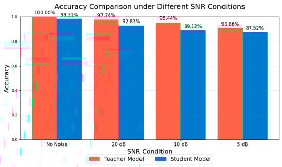 As illustrated in Figure 17, we compared the classification accuracy of the teacher and student models across four conditions: noise-free, 20 dB, 10 dB, and 5 dB. The results indicate that, as the SNR decreases, the recognition performance of both models deteriorates to varying extents. The teacher model achieves nearly 100% accuracy in noise-free conditions and maintains approximately 90% accuracy even at 5 dB, demonstrating strong robustness to noise. Comparatively, the student model shows a slight decline in accuracy under high-noise conditions but still achieves close to 87% accuracy at 5 dB. This indicates that, despite being lightweight, the student model retains a notable resilience against noise perturbations.