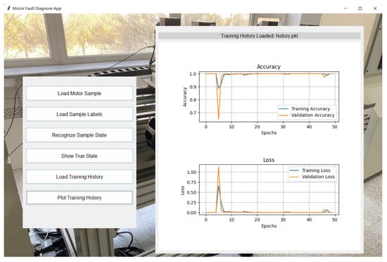 The application utilizes the quantized student model to identify fault statuses for the servo motor. With its compact size and low computational requirements, the quantized model is well suited for operation on resource-constrained devices. Users can load motor vibration samples directly through the interface and view the real-time identification results. Additionally, the application integrates a training history feature that allows users to view accuracy and loss curves from the model’s training process, providing insights into the model’s learning performance. The entire design process prioritized operational convenience and user experience in industrial settings, aiming to simplify the complex diagnostic process, enabling users to complete the entire process—from data loading to fault identification—in just a few clicks.