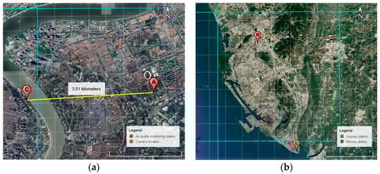 Data acquisition location maps. (a) Shanghai dataset: the distance between the surveillance camera location and the air quality monitoring station is 3.51 km, and (b) Kaohsiung dataset: each surveillance camera location and the corresponding air quality monitoring station are co-located at the same site, where the cyan grid represents meteorological data units.