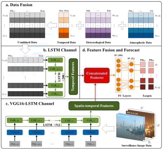 The network architecture of dual-channel integrated model. (a) Data fusion module: Combines multi-source homogeneous numerical data into a unified format for processing; (b) LSTM single-channel network module: Extracts temporal features from atmospheric, meteorological, and temporal data; (c) VGG16-LSTM single-channel network module: Extracts spatiotemporal features from surveillance image sequences; and (d) Feature fusion and forecasting module: Merges features and outputs time-series predictions of PM2.5 and PM10 concentrations.