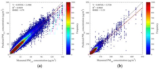 Scatter density plots of forecast results of two atmospheric particulate matters. (a) PM2.5 and (b) PM10. Black dashed lines denote 1:1 lines, and red solid lines denote best-fit lines from the linear regression. Note: A single ground truth value (x-axis) may correspond to multiple predicted values (y-axis) in the scatter plot because each ground truth value can appear at different forecasted time points in different sample sequences when using the sliding window approach for sample generation.