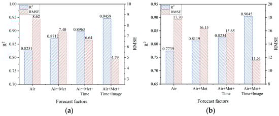 To enhance forecasting accuracy, the study integrates various factors, including images, atmospheric data, meteorological data, and temporal data. Figure 4 compares the forecasting results obtained by using different combinations of these factors. The results based on combinations of atmospheric, meteorological, and temporal data (Air, Air + Met, Air + Met + Time) were obtained using the aforementioned LSTM model, while results using all data sources (Air + Met + Time + Image) were derived from the dual-channel model that integrates the LSTM and VGG16-LSTM networks.