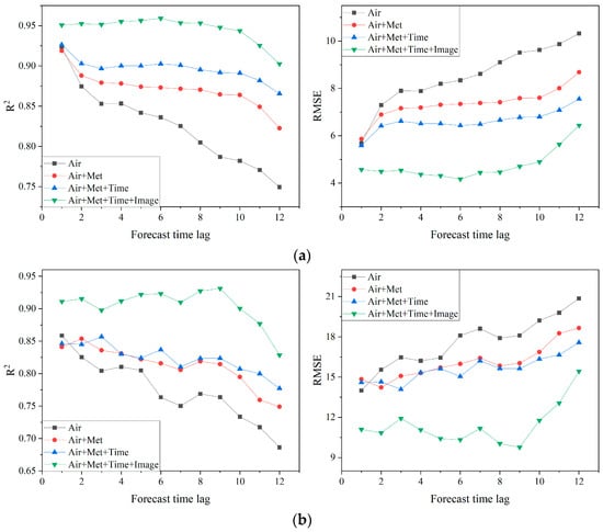 Figure 5 also shows a general decline in forecast accuracy as the forecast time lag increases for both PM2.5 and PM10, a trend consistent with the decrease in autocorrelation of air pollutants over time [36,54], which impacts forecast effectiveness for longer horizons. Notably, the rate of decline in forecast performance is more pronounced for single-channel models, which is related to the number of forecasting factors involved. In contrast, the dual-channel model demonstrates more stable performance, particularly within the first 10 h, owing to its integration of multi-source data, including surveillance images. The analysis of forecast performance on different time lags underscores the effectiveness and robustness of the proposed dual-channel model on time-series forecasts.