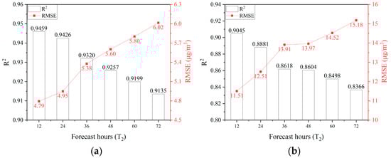 However, a decline in R2 values and an increase in RMSE values are observed as the forecast horizon extends (including beyond 72 h), indicating an inverse relationship between forecast accuracy and duration. The longer the forecast duration, the greater the prediction uncertainty. Consequently, in practical applications, it is crucial to balance the trade-off between forecast accuracy and the desired forecast duration, ensuring the model meets the specific requirements of air quality management tasks.
