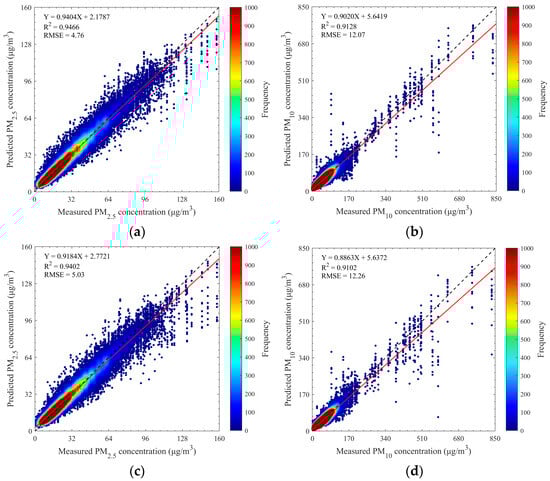 Scatter density plots of forecast results of two atmospheric particulate matter with different data processing approaches for missing values. (a) PM2.5 forecasts with data interpolation, (b) PM10 forecasts with data interpolation, (c) PM2.5 forecasts with data deletion, and (d) PM10 forecasts with data deletion. Black dashed lines denote 1:1 lines, and red solid lines denote best-fit lines from the linear regression.