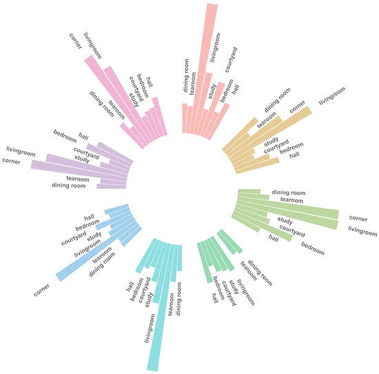 The quantitative relationship between Ming-style furniture and other decorations is shown in Figure 4. In the dining room, Ming-style furniture is often placed in the form of a furniture combination, paired with more than eight types of modern accessories to create a warm atmosphere. In the corner, 1–2 pieces of Ming-style furniture are collocated with more than seven modern decorative items to reflect a tranquil space. In bedroom spaces, Ming-style furniture, due to its robust material characteristics, is often matched with more soft furnishings to design a comfortable ambiance. In entryway scenarios, both furniture and decorations are reduced to reflect simplicity.
