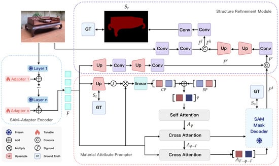 To overcome the aforementioned limitations, we propose (1) a material attribute prompter (MAP) to automatically learn an optimal prompt for each input image and (2) a structure refinement module (SRM) to refine the predicted mask. The MAP consists of a set of contextual prompts and a set of basic prompts, initialized by the coarse segmentation map and a zero map, respectively. Both contextual and basic prompts are learnable and adaptable for attribute-specific prompts. The SRM incorporates both the output of the mask decoder and the original image; in this way, the semantic features are enhanced by low-level features to improve the structure of the final segmentation.