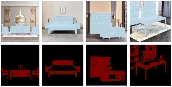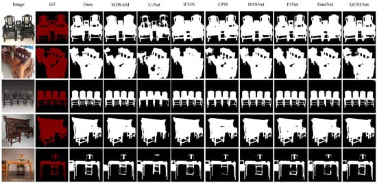 Salient object detection (SOD) aims to predict the pixel-level masks of the objects that attract human visual attention. GateNet [] designed a gated dual-branch structure to establish a cooperative relationship between features of different levels to increase the network discriminability. ICON [] introduced three diverse feature aggregations, an integrity channel enhancement, and part–whole verification to SOD. Zhao et al. [] analyzed whether the depth was really important at the inference stage of the RGB-D SOD. Since we define the Ming-style furniture image segmentation as a special SOD task, several SOD models [,,,,,,] are adopted for comparison to verify the effectiveness of the proposed method.