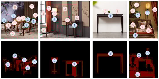 The SAM (segment anything model) [] is a vision foundation model for image segmentation. It was built in a data collection loop with over 1 billion masks on 11 M images. Apart from the image, the SAM allows various prompt inputs to extend the zero-shot capability for unknown classes and tasks. Several works include applications of the SAM. Ma et al. [] extended the success of SAM to medical images by fine-tuning the model with a large-scale dataset over 200 K masks across 11 different modalities. Zhang et al. [] explored the personalization of SAM using specific visual concepts and provided a training-free PerSAM and a fine-tuning PerSAM-F. Moreover, the SAM has also been extended to remote sensing scenes [], where 105,090 high-resolution remote sensing images and 1,668,241 instances were used to scale up the SAM. Despite the success of the SAM and its variations, the previous works require careful prompt design before automated segmentation; hence, they cannot be directly transferred to Ming-style furniture image segmentation.