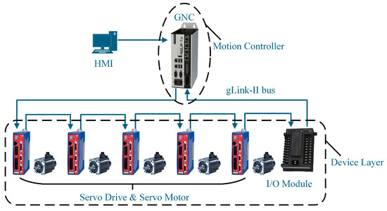 The topology of a CNC system plays a crucial role in determining its real-time performance, scalability, and capability for intelligent functionality [35,36,37,38,39,40]. Figure 1 illustrates the topology of the CNC system. It utilizes an embedded controller (GNC) based on the gLink-II bus to enable high-speed communication and precise motor control.