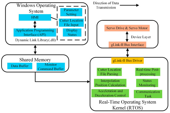 A layered architecture is proposed for the CNC system, which includes the Windows operating system for human–machine interaction and an RTOS kernel for real-time control tasks. Data exchange between these two systems is achieved through Shared Memory, as shown in Figure 3.