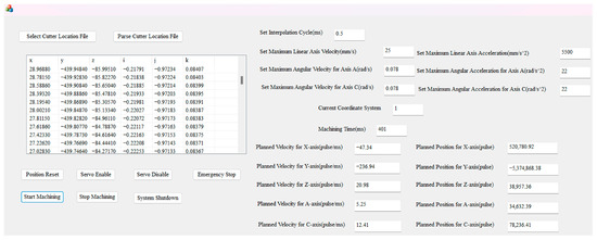 This study takes an A-C dual-rotary head CNC machine as an example and directly performs linear interpolation calculations on the six parameters in the .CLS format [49]. The trapezoidal acceleration and deceleration of the translational axes are adjusted in accordance with the maximum permissible rotational velocity and angular acceleration of the A- and C-axes. After the real-time calculation of the target interpolated cutter location for each interpolation cycle, post-processing calculations are conducted to generate motion control command data for all five axes. The interpolated command data are then transmitted in real time to the hardware layer via bus communication.