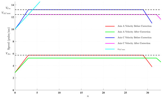 Subsequently, the maximum composite acceleration amax of the translational axes for trapezoidal acceleration and deceleration is reassigned. The value of (amax)′ from Equation (12) is used as the new value of amax for velocity planning.