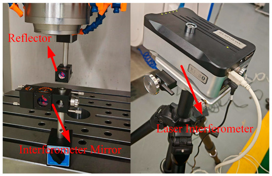 Theoretical time is recorded using the high-precision timer interface, GTN_GetClockHighPrecision, integrated within the motion controller. Actual time is measured in real-time using a laser interferometer, as shown in Figure 12. This interferometer is connected to the FPGA of the motion controller and synchronized with an external clock.