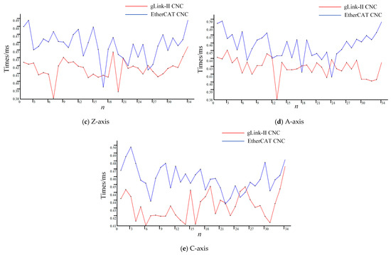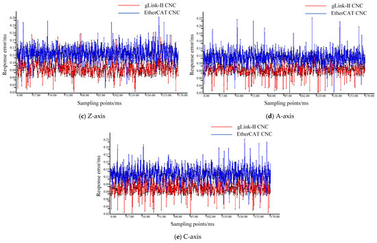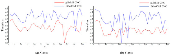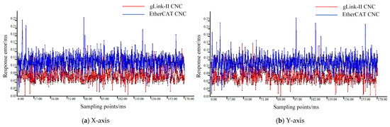 To highlight the advantages of the CNC system developed based on the gLink-II protocol, a comparative analysis of the response errors is conducted against a CNC system developed using the EtherCAT protocol. A comparison between the gLink-II and EtherCAT controllers of the same brand is shown in Figure 11.