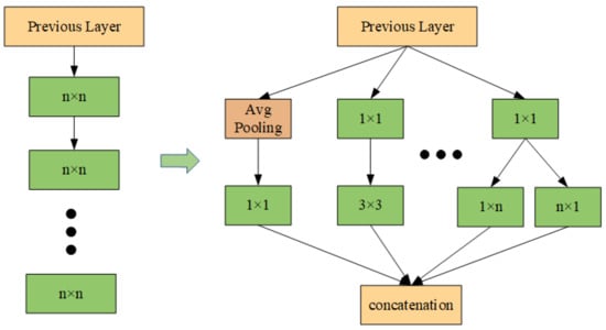 Prior to the inception of the Inception network, numerous popular CNN architectures attempted to enhance the performance of the model by increasing the number of convolutional layers. However, this approach presents a number of challenges. (1) A network that is excessively deep is prone to overfitting, and gradient propagation becomes increasingly difficult; (2) merely stacking larger convolutional layers increases computational costs. To address these issues, the Inception module introduces a parallel convolution strategy, whereby multiple convolutional kernels of varying sizes are applied to the same layer, thus processing the input data in parallel. The structure of the network becomes ‘wider’ rather than ‘deeper’, thereby enabling features to be extracted at different levels from multiple scales, as illustrated in Figure 1.