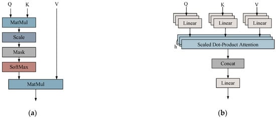 The self-attention mechanism [] is a process that enables the dynamic adjustment of the representation of each element by calculating the similarity between elements in the input sequence. This mechanism facilitates the capture of global dependencies by assigning a weight to each element based on its relationship with other elements during the computation of its representation. As illustrated in Figure 3a, scaled dot product attention (SDPA) is demonstrated. The fundamental aspect of the methodology is the calculation of the correlation between each element in the input sequence and other elements, which can be conceptualized as attention weights. These weights are then employed to weight and sum the sequence, thereby obtaining a new representation. This representation not only preserves the information of all elements in the sequence but also identifies the salient portions relevant to the current element.