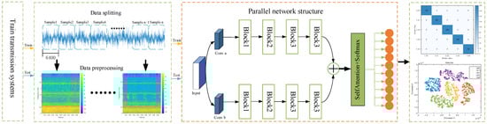 In the data preprocessing stage, the signal is segmented by fixed-length sliding windows, each of which has a length of 6400 sample points (i.e., 0.1 s), and a step size of 6400 points as well, with a non-overlapping window to avoid redundancy and to ensure the diversity of the samples. In order to extract the time–frequency characteristics of the signal, the short-time Fourier transform (STFT) was used to convert the one-dimensional signal into a two-dimensional time–frequency map (e.g., Figure 4, data preprocessing section). The parameters are set to Hamming window (window length 2048, overlap 1024, FFT points 2048), and this configuration can effectively balance the time and frequency resolution. Finally, all time–frequency images were normalized in the range of [0, 1] to ensure training stability and accelerate convergence.