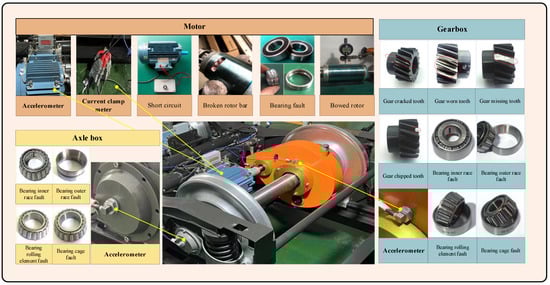 In order to ascertain the efficacy of the proposed network, this paper presents the findings of a fault simulation experiment conducted on the metro train drive train system. The experiment involved the collection of multi-source sensor signals under a range of health states. The experimental platform is an urban bogie failure simulation experimental bench, as illustrated in Figure 5. The ratio of the experimental platform to the real bogie is 1:2. As illustrated in Table 2, the dataset encompasses nine distinct operational scenarios. The different speeds are employed to simulate varying train speeds, while the different lateral loads are used to simulate straight lines or rounded corners. The experiment involved the collection of two types of signals: three-way vibration and three-phase current. Two triaxial acceleration sensors were positioned at the driving and non-driving ends of the motor, while a three-phase ammeter was placed at the motor cable. A triaxial acceleration sensor was installed at the input and output shafts of the gearbox, as well as at the axial endcap, resulting in a total of 18 channels. The sampling frequency of each channel was set to 64 kHz. The experimental data were collected using a DAQ data collector. The experiment simulates the effects of different health states of the train drive train components (motors, gearbox, and axle box bearings), including normal and 16 typical single faults. Images of the faulty components of the motor, gearbox, and axle box are shown in Figure 5.