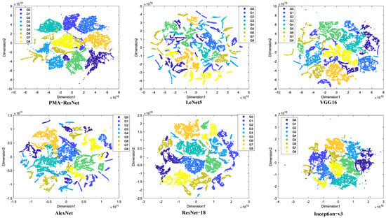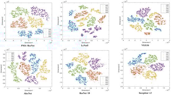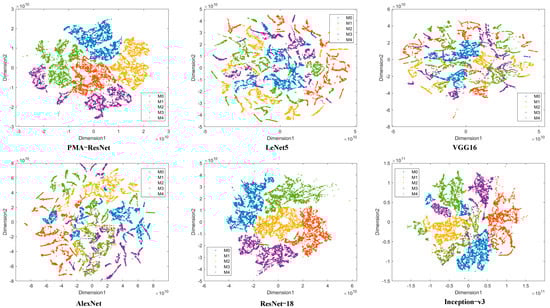 In order to facilitate a more comprehensive analysis of the feature extraction capability, the features extracted by the aforementioned six algorithms were projected into a two-dimensional space (utilizing the default parameter settings) through the implementation of the t-SNE visualization technique. The resulting data are presented in Figure 6. Figure 6 demonstrates the superiority of PMA-ResNet over alternative methodologies in differentiating between disparate classes of samples. In particular, PMA-ResNet is effective in clustering data points into distinct classes with high similarity within each class and significant differences between classes, thereby enhancing classification performance.