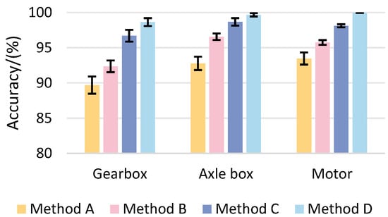 The results of the ablation experiments are shown in Table 9 and Figure 9. The results of the ablation experiments demonstrate that the diagnostic accuracy of Method B is significantly enhanced in all three devices when compared to Method A. The average increase in accuracy is 2.67%, 3.78%, and 2.28%, respectively. This improvement substantiates the assertion that the incorporation of the multi-scale learning module markedly enhances the capture of fault feature information and fortifies the network’s capacity for feature extraction and classification. This exemplifies the efficacy of the multi-scale learning module. Method C, based on Method B, introduces the self-attention mechanism, resulting in further improvement in diagnostic accuracy, particularly in the case of the gearbox. This indicates that the self-attention mechanism has a significant impact on enhancing the model’s capacity to focus on intricate data. In comparison to Method C, the complete method, comprising a parallel structure, multi-scale learning module, and self-attention mechanism, exhibits exceptionally high diagnostic accuracy with regard to the fault data of the gearbox, axle box, and motor. This serves to validate the efficacy and superiority of the method.