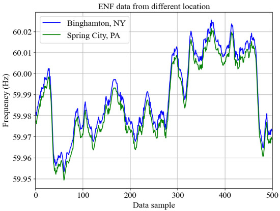 ENF is a time-varying signal fluctuating across its nominal frequency value of 50 Hz or 60 Hz based on the power supply demand from electrical power grids [26]. In the United States, the ENF nominal value is 60 Hz, whereas most Asian and European countries have a nominal value of 50 Hz. Due to the power supply and demand fluctuations throughout the power grid, the load balance mechanism of the generator system results in the fluctuation of ENF from its nominal value within a range. The ENF fluctuates in the range of [−0.02, 0.02] Hz in the United States and [−0.05, 0.03) Hz in Asian and European countries [41]. The fluctuations in the ENF signal are propagated throughout the power grid interconnect, and thereby, any observed ENF fluctuations for a particular time instant should reflect similar volatility. Figure 1 represents the ENF signal simultaneously recorded from two cities in different states, 180 miles apart, where both cities belong to the Eastern power grid interconnect. With ENF estimated from the multimedia recordings and the existence of a parallel ground truth reference database, a signal can be matched for its accurate recording time [42]. Leveraging the unique fluctuating nature and presence in multimedia recordings, the ENF signals have been applied in areas like digital forensics [26], location-based geo-tagging [43], surveillance video authentication [44], and Deepfake attack detection [17].