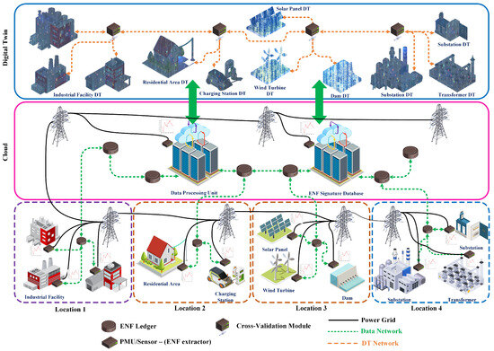 The Digital Twin Layer at the top illustrates several DTs of physical infrastructure within the smart grid. DTs are virtual replicas that simulate the behavior and operations of the corresponding real-world assets. These data DTs interact and exchange information through a DT Network (orange dashed lines). Each digital twin replicates a specific element of the smart grid, such as industrial systems, residential environments, or specialized facilities. The primary role of these DTs is to facilitate continuous monitoring, predictive maintenance, and optimization of grid operations. DTs rely on real-time data to accurately mirror physical systems and help cross-verify data authenticity by leveraging ENF anchors as a security measure.