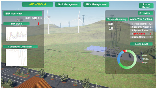 As illustrated in Figure 3, our virtual smart grid scenario encapsulates key elements of a Microgrid, including a local substation, solar panels, wind turbines, transmission lines, monitoring UAVs, and a small factory. Each of them is meticulously modeled to reflect real-world counterparts. By integrating live sensor data and physical facility information, this virtual space accurately replicates the operational state of the smart grid, enabling real-time management of power distribution and UAV coordination [62]. A notable feature is the daily alarm report, which categorizes events such as trespassing, security breaches, ENF anomalies, and UAV-detected issues. The ENF alarm, in particular, leverages correlation analysis with ground truth data to validate DT authenticity, offering a clear and compelling visualization of the effectiveness of ANCHOR-Grid to distinguish legitimate representations from deep-fake threats. This Graphic User Interface (GUI), depicted in Figure 3, transforms complex data into an intuitive and actionable tool, underscoring the practical relevance of our approach to smart grid security.