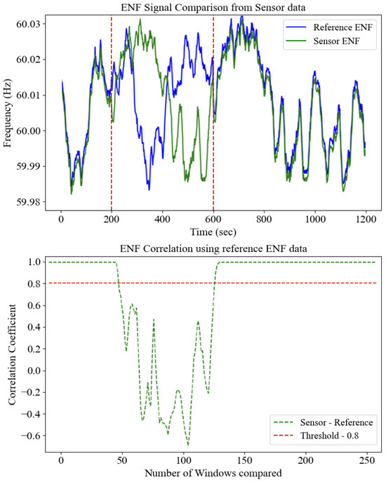 Leveraging lightweight signal estimation algorithms such as the short-time Fourier transform and the correlation coefficient for signal similarity, we establish an ENF authentication module for the data captured from independent sources simultaneously instant [44]. Although the ENF signal is accessible to external adversarial actors, combining the ENF signal and a unique device identifier enables an additional layer of security. Given this measure, remote manipulation of the sensor data becomes challenging due to the location-based fluctuations of the ENF signal and unique sensor device identifiers.