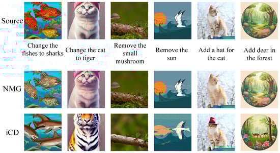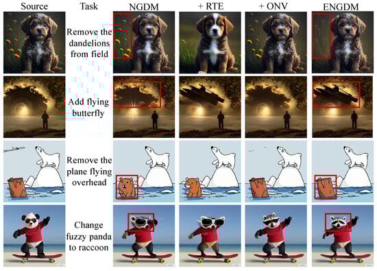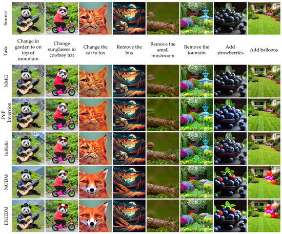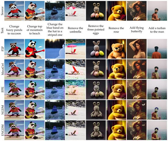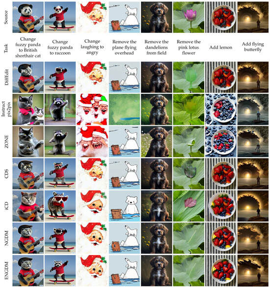 Datasets. As summarized in Table A1, we evaluate the performance of our method on four diverse datasets, including PIE [18], ZONE [46], Imagen [47] and EMU [48]. The PIE [18] dataset consists of 700 images spanning 10 different editing types, including “objects change”, “attributes change”, “add”, “remove”, etc. The images are categorized into four content groups: animals, humans, indoor scenes, and outdoor scenes. The PIE dataset provides a diverse and challenging set of tasks for evaluating editing capabilities. The ZONE [46] dataset contains 100 samples, including 60 real images sourced from the internet and 40 synthetic images. This dataset focuses on three primary editing operations: 32 images for “add”, 54 images for “change”, and 14 images for “remove”. The Imagen dataset is a synthetic dataset that contains 180 images collected from https://imagen.research.google/ (accessed on 10 April 2025), which are generated by the method of Imagen [47]. Editing prompts are constructed by replacing parts of the original text. Each image undergoes 10 different attribute replacements, resulting in a total of 1800 test examples derived from the original 180 images. The EMU [48] dataset is a more extensive dataset containing 3314 test images across seven categories of image-editing tasks. To ensure high-quality test samples, EMU Edit applies a post-validation phase to filter out low-quality examples. We collect images from the high-quality HQ-Edit dataset [49] to form a new benchmark referred to as the HC dataset. The HC dataset contains 958 images, each with the height and width larger than 1024. During optimization and evaluation, all images are resized to a resolution of 1024 × 1024. These datasets comprehensively cover diverse images and editing tasks, ensuring a robust evaluation of our method.