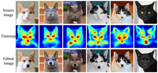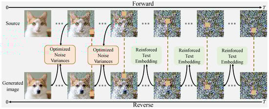 The noisy latent at step t is obtained from Equation (15), which combines the denoised result with guidance scale w and the noisy observation from the forward process. The denoised result at the same step is obtained using a larger guidance scale with . Unlike some methods [27,43] that use CLIP loss [44] to align images and target text prompt, which makes the optimization process difficult and resource-consuming, our proposed editing reinforcement loss can be optimized directly in the latent space in an efficient way. The loss function for optimizing the text embeddings is applied only during the early stages of the denoising process, as these stages are more inclined toward generating diverse content.