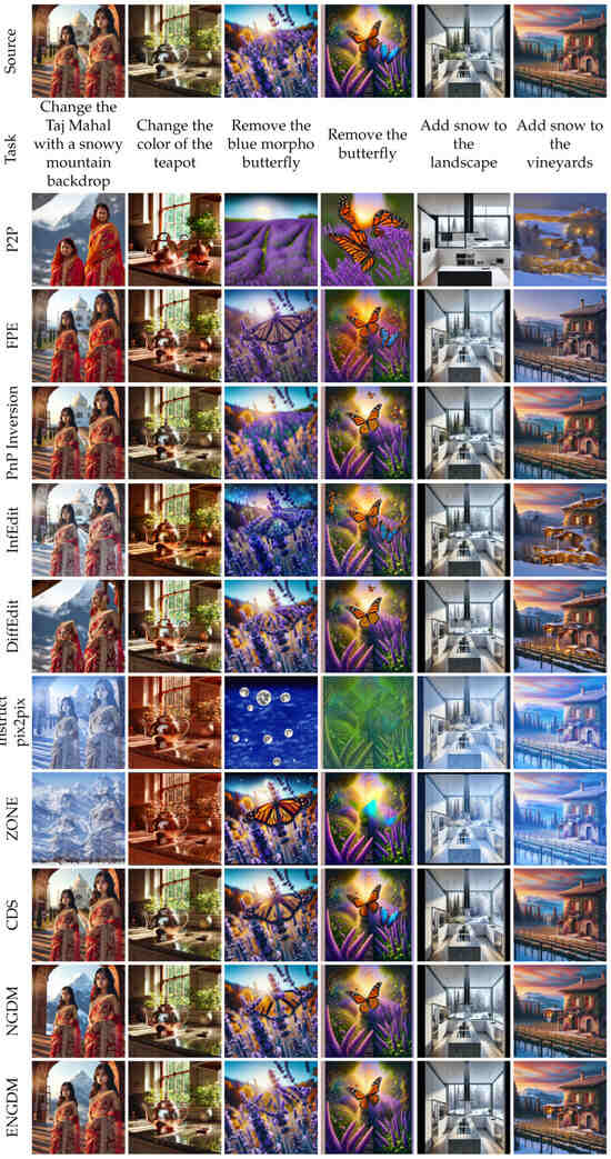 Figure 3, Figure 4, Figure 5 and Figure 6 show qualitative comparisons between our method ENGDM and the other baseline methods. In each figure, the first row shows the source image, the second row displays the editing task, and the subsequent rows show the edited images generated by different baseline methods, NGDM, and ENGDM.