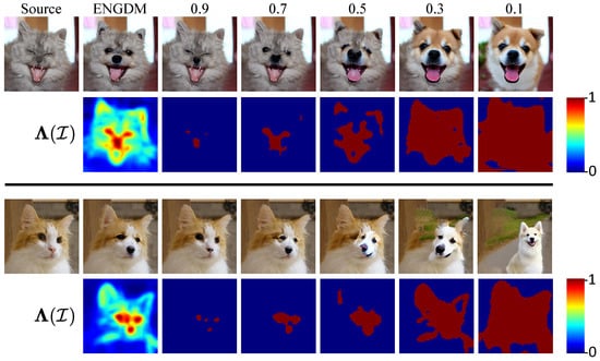 The pixel with the larger value in the degree map should be added with the noise with larger variance. We define the weighting matrix by applying a sigmoid function to the degree map , i.e., , with a and b denoting the hyperparameters for the transformation. By substituting each pixel’s noise variance and the maximum diffusion time step T into Equation (8), we can obtain the total diffusion time for each pixel. We discuss the effect of hyperparameters a and b on the generation of images in Section 5.3.2 and validate the effectiveness of the method for determining the total diffusion time step of each pixel in Section 5.3.5.