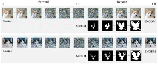 where is a one-dimensional Wiener process when time flows backward from to 0, and the initial value of the above SDE is . Theorem 1 establishes the conclusion that the NGDM in Equation (7) can be rectified to the IGDM in Equation (9) but with different total diffusion time for different pixel indexed by k, determined based on Equation (8). This inspires us to utilize the pre-trained IGDM to achieve the data-sampling of NGDM for image editing. Subsequently, we propose adjusting the total time of noising and denoising for each pixel k to , enabling the utilization of pre-trained IGDM for data sampling.