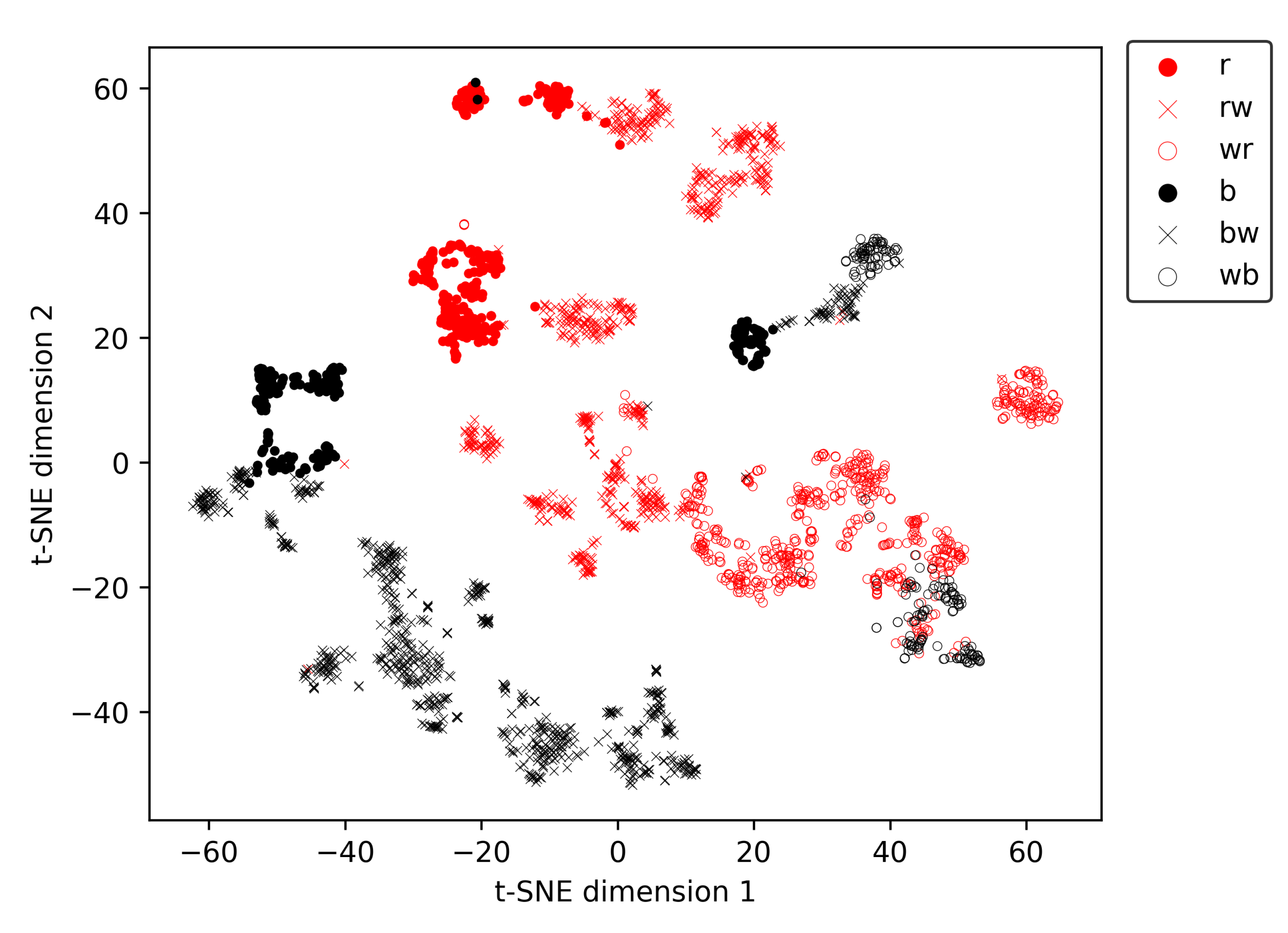 Figure 9 and contains only black-haired animals. The second large metacluster is banana-shaped and located more centrally in the figure. This metacluster contains predominantly red-haired animals, together with instances of a single animal with a wb coat pattern. The third and smallest metacluster is positioned in the middle of the previously described banana-shaped metacluster and contains only black-haired animals. The single black-haired animal in the second, predominantly red-haired, metacluster is an almost entirely white animal with only a few small black patches, of which none have a diameter larger than 20 cm. Therefore, it is no surprise this animal ends up in the predominantly red-haired cluster. After all, there are several red-haired individuals which also have only a few small red patches in their coat, while the other wb animal in the dataset has much larger, more elongated black patches, with dimension well over 50 cm. In each metacluster, the amount of white in the coat increases along the main axis of the metacluster. For example, for the predominantly red-haired metacluster, all predominantly red-coloured animals are located at the top-left of the metacluster. More towards the right/bottom of the metacluster, the red and white (rw) coloured animals are located, while all the white and red (wr) animals are situated at the bottom-right part of the metacluster.
