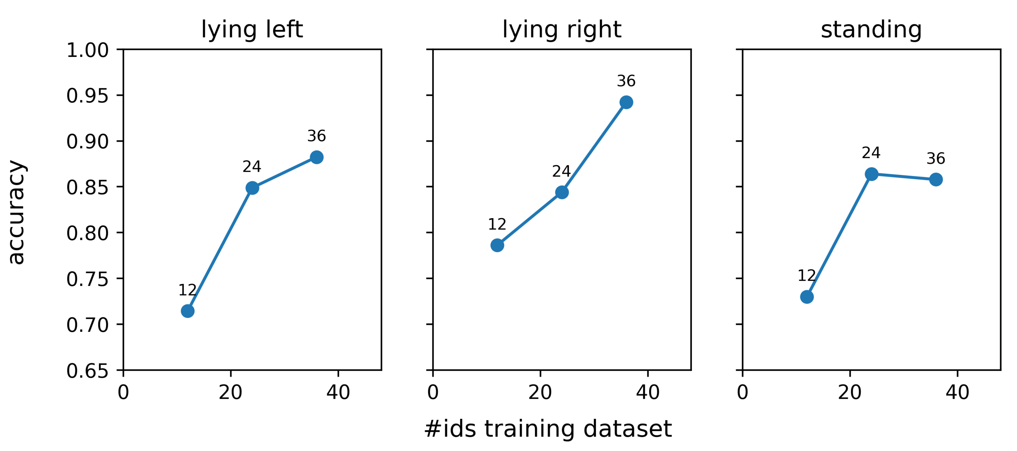 fictive individuals per actual individual. Since our complete training dataset contained 36 actual individuals, this corresponds to a total of 864 fictive individuals. Nevertheless, during evaluation, the number of individuals the algorithm has to distinguish is always 12, the number of actual individuals in the test dataset. Hence, the results presented in this paper can be considered as being a result of training an embedding network using a dataset of 864 (fictive) individuals and subsequently evaluating the obtained network on a test dataset containing 12 individuals.
