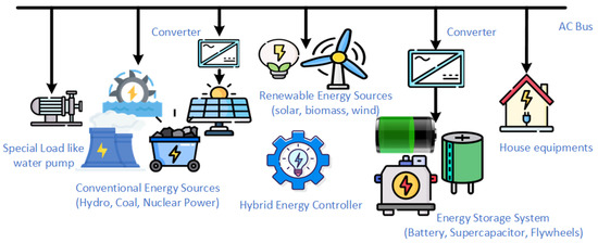 Although HESs have many advantages, they also have several technical issues, especially when it comes to system power quality. These difficulties include power fluctuations brought about by plug-and-play renewable energy systems (RESs) or the addition of more renewable energy sources [8]. Additionally, when switching between grid-connected and stand-alone modes, there may be variations in voltage and frequency. To alleviate power quality issues and ensure reliable, stable, and high-quality power output, HESs must be equipped with sophisticated control techniques [9].