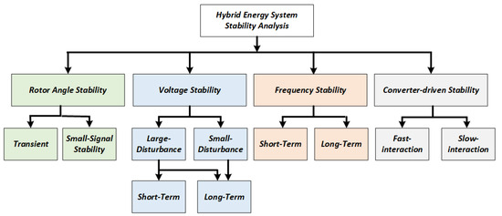 There are different types of stability analysis for power systems based on time span and intensity, which can be applied to HES [34]. In 2004, the IEEE/CIGRE Joint Task Force on Stability Terms and Definitions [34] categorised stability analysis into three groups, namely rotor angle stability, voltage stability, and frequency stability analysis. However, in 2016, due to the emergence of power electronics technologies and their growing utilisation for the integration of renewable energy, energy storage and power electronic loads, the committee added a new category called converter-driven stability analysis [41]. Because of the converters, the power system’s dynamic reaction is increasingly relying on the quick response of the power electronic devices, which modifies the system’s dynamic response. That’s why a new category of stability analysis is required. Figure 3 lists all categories of stability studies required for HES. Even though all forms of stability are linked and lead to one another, it is crucial to examine each independently to have a proper understanding.