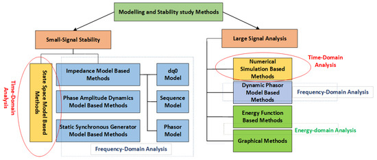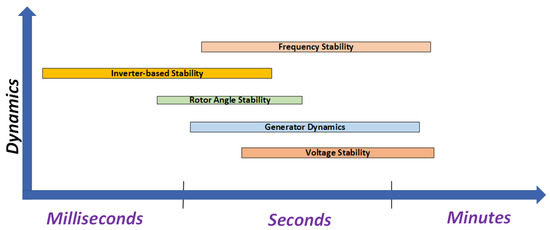In power system stability analysis, the time span plays a critical role in defining the type of stability problem and the corresponding analysis required. Typically, stability analysis is performed over time spans ranging from seconds to a few minutes following a system disturbance. Moreover, it is essential to model the system appropriately based on the study time span [40], as the modelling approach varies depending on the specific type of stability analysis being conducted. Different phenomena occur at different time scales, such as short-term stability over seconds or long-term stability over hours. The results of stability analysis help in customizing control strategies, ranging from quick fixes for disruptions to long-term stability planning. Reliable and effective power system operations and management are ensured by the time-span consideration. After a time span, the intensity of disturbance also affects the stability type. In case of a small disturbance, a small-signal analysis is performed. If the disturbance is large, transient stability analysis is conducted. Figure 2 describes different types of dynamics of stability analysis based on different time spans.