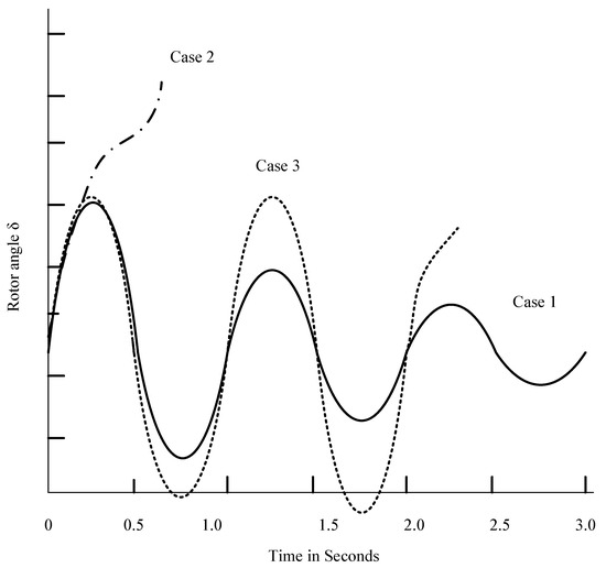 In Figure 4, the behaviour of synchronous machine rotor angle is shown for stable and unstable conditions. In case 1, the rotor angle reaches its greatest value, then falls and oscillates with a diminishing magnitude until stabilising. In case 2, synchronisation is lost and the rotor angle sharply increases. First-swing instability is the term for this kind of instability. In case 3, the rotor angle remains steady during the initial swing before becoming unstable due to increasing oscillations. This leads to the small-single instability.