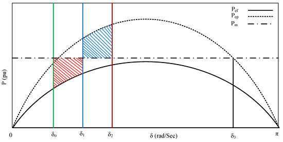 The above-explained time-dependent differential equation, Equation (1) is used to do the transient analysis. This equation is solved numerically using techniques such as step-by-step integration or the Runge-Kutta method. In light of the uncertainties associated with renewable power generation, the work [43], has proposed a methodology for examining the initial swing rotor angle stability of power systems. Another popular method for transient stability analysis is the Equal Area Criterion (EAC), which is a graphical approach for assessing stability in single-machine infinite bus systems [44]. The analysis involves studying pre-disturbance conditions, the system response during disturbances, and recovery after clearing faults. EAC diagram is shown in Figure 5. is electrical power during the fault, is electrical power post fault. is the initial rotor angle i.e., at the time of the fault, is the angle at fault clearing, is the maximum swing for the rotor, and is the maximum permissible rotor angle after the fault. The Area covered by red is the accelerated power, and the area covered with blue is the decelerated power. When accelerated power is equal to the decelerated area, the system’s stability is ensured. A critical parameter in this analysis is the Critical Clearing Time (CCT), representing the maximum allowable time to clear a fault without losing synchronism.