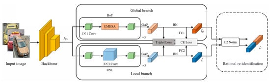where fN denotes the feature embedding of the N-th branch, x is the input image, FN4 denotes the N-th branching layer, Fs123 denotes the backbone network in front of the multi-branch network, GAP denotes the global average pooling, is the shared weights, and is the weight of the first N branch. The embeddings obtained from each branch are L2 normalized to ensure equivalent contributions and then stitched together to obtain the final feature representation. In the above way, the multi-branch architecture extracts multiple global embedding, and each branch has a specific task and feature extraction method, focuses on learning different types of information, and, finally, obtains diversified features with richer information. When the network is trained, each branch loss is trained independently, and the global loss is obtained by a weighted linear combination of each branch loss as follows: