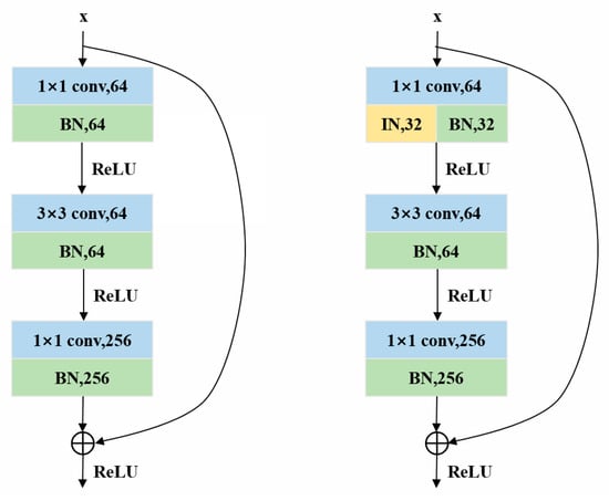 As shown in Figure 2, the ResNet50 network makes extensive use of a batch normalization layer, which normalizes the output by calculating the mean and variance of the current batch to accelerate training and stabilize the training process. However, the batch normalization layer is affected by the appearance (e.g., illumination, change of viewing angle) and the difference of data distribution, which will lead to the degradation of the network’s generalization ability. In this paper, the backbone network adopts the ResNet50-IBN network structure, which uses both instance normalization and batch normalization in the shallow layer of the network, and only batch normalization in the deep layer on the network.