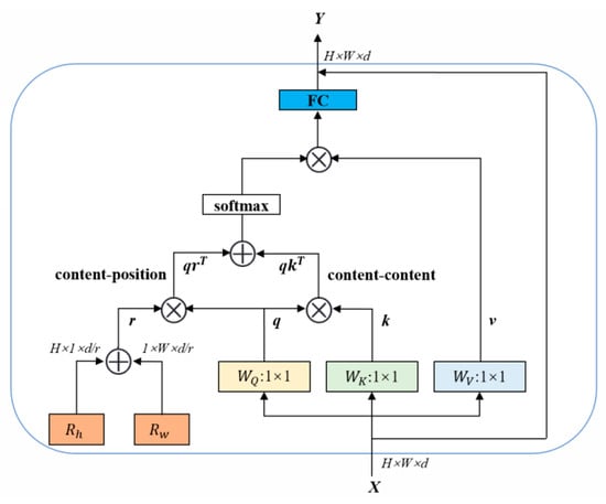 When calculating Query(q), Key(k), and relative position encoding r, each is first divided by a reduction factor to reduce computational complexity (the computational complexity of attention weight calculation is reduced from O(L2d) to O(L2d/r), where L represents the total spatial dimension length of the feature map, and d denotes the number of channels) and control numerical stability. The attention score consists of the dot product qkT between q and k and the dot product qrT between q and r. The total attention score is denoted as qkT + qrT. The operator “⊕” denotes element-by-element addition, “⊗” denotes matrix multiplication, and “1 × 1” denotes 1 × 1 convolution for changing the number of channels without changing the feature map size. Next, the attention scores are normalized by the Softmax function to obtain the attention weight matrix, and matrix multiplication is performed with the Value (v) vector to generate the weighted summed feature representation. To further enhance the network representation, the generated feature representation is transformed through a fully connected layer, and, finally, the transformed features are residually connected to the input features to facilitate gradient flow and avoid information loss.