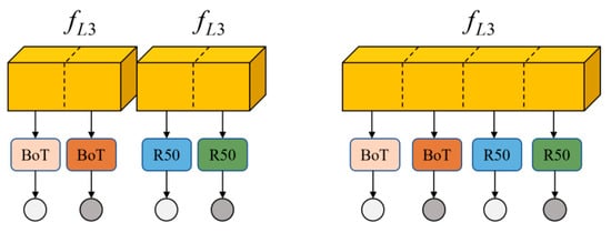 A variant of the architecture using different grouped convolution strategies is shown in Figure 4. The architecture is directly based on the image features initially extracted by the ResNet50-IBN backbone network for processing, with the BoT and R50 corresponding to the global and local branches in the multi-task learning vehicle re-identification network above, respectively, and the loss functions represented by circles, with the lighter color representing the cross-entropy loss and the darker color representing the ternary loss. The left figure shows that the features extracted from the backbone network are first expanded into two groups, and then the grouping convolution operation is applied to each group of features separately, which reduces the computational burden of each branch by grouping the features, while retaining sufficient feature expressiveness.