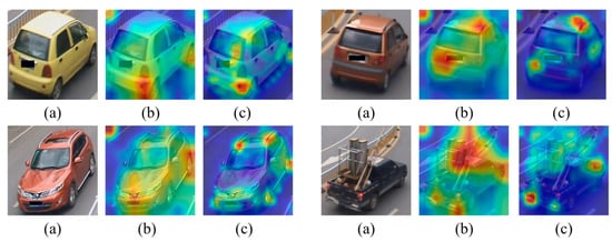 In order to study and explain the network behavior, the focus areas that the network focuses on when processing vehicle images are visualized by generating a heat map of the feature maps. Firstly, the feature maps output from the last layer of the model are obtained through forward propagation; then, the feature maps are subjected to an up-sampling operation to match their dimensions with the input image; finally, the maximum value is taken along the channel dimensions to generate a single-channel heat map, which is superimposed on top of the original image. As shown in Figure 5, (a) is the input vehicle image, (b) is the feature map heat map obtained from the baseline network ResNet50-IBN, and (c) is the feature map heat map obtained from the IBNT-DL4B network proposed in this paper.