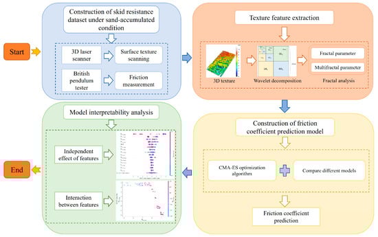 As shown in Figure 1, the flowchart of this interpretable skid resistance evaluation study is divided into four main parts, each with specific tasks and objectives. The first step is to construct a skid resistance dataset under sand-accumulated conditions. This involves using a 3D laser scanner to capture surface texture and a pendulum friction meter to measure friction coefficients. Next, texture features are extracted through a wavelet transform and fractal analysis to obtain detailed features like fractal and multifractal parameters. Then, a friction coefficient prediction model is developed by comparing and selecting the best evaluation model, which is then fine-tuned using the CMA-ES optimization algorithm. Finally, the model interpretability is analyzed. This includes assessing the individual impact of each feature on the model output and how features interact to influence predictions. By analyzing the model’s interpretability, we can understand its decision-making process and identify the most influential features.