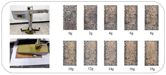 To measure skid resistance under sand-accumulated conditions, sand of different volumes was evenly spread in the test area to simulate such conditions. The sand content per unit area was calculated using Equation (1):